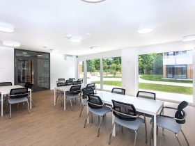 - V pritličju vsakega objekta je opremljen skupni prostor za druženje stanovalcev s čajno kuhinjo in sanitarijami, pralnica s pralnim in sušilnim strojem.