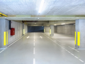 - Skupaj je 50 parkirnih mest, pri čemer jih je 10 namenjenih invalidom. V garaži pod objektoma je 35 parkirnih mest, preostalih 15 pa je pred objektoma.